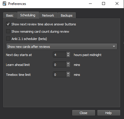 Anki 2.1 scheduler (beta) : când am început să umblu la setări, aveam deja câteva carduri introduse și am înțeles că s-ar putea să îți afecteze puțin dacă îl activezi în condițiile astea. Dacă ești complet începător, poți încerca. Găsești multe informații dacă vei cauta pe reddit/quora. Nu sunt foarte sigură ce avantaje ar fi.