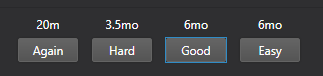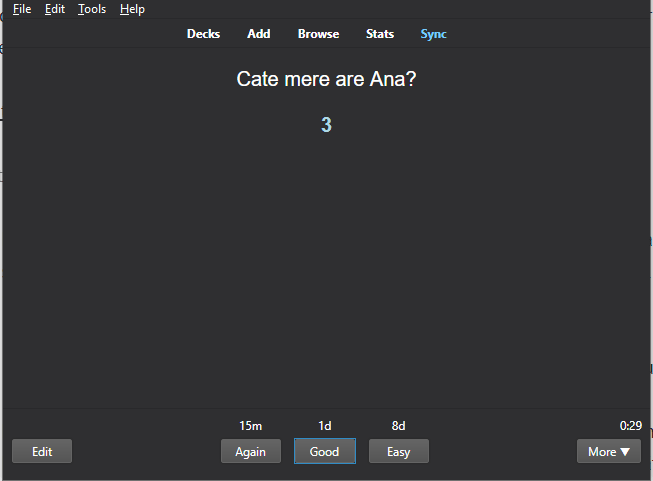Vă zic asta doar în ideea să nu profitați de acest buton prea des, dacă veți da mereu Again, cardurile vă vor apărea prea des și 1) o să vă dea impresia că știți, când de fapt doar l-ați văzut de foarte multe ori și 2) la un moment dat se vor strânge foarte multe carduri și nu o să mai faceți față aka „The Ease Hell” (un termen foarte intuitiv dacă mă întrebați pe mine)