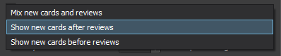 Show new cards: prefer să fac carduri noi după ce îmi termin review-urile, cred că este foarte important să fixezi ceea ce ai învățat înainte să adaugi ceva nou. Dar nu e ceva bătut în cuie.