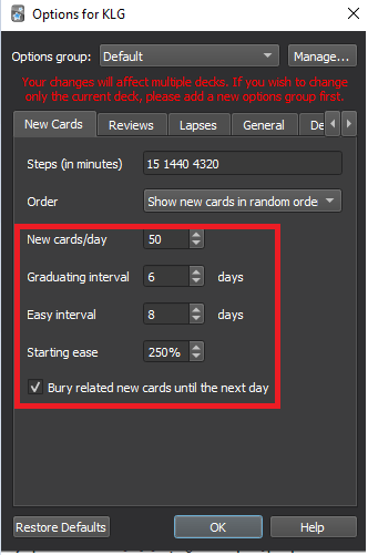 Bury related new cards înseamnă că nu îți vor apărea carduri făcute din același note într-o zi (diferența dintre card și note o lăsăm pentru altă dată).