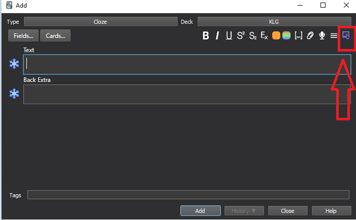 Click pe Add din meniul principal Anki, apare clasica imagine și selectați iconița indicată în chenarul roșu.