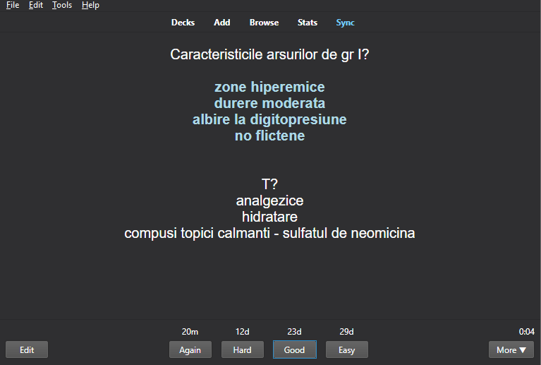 - Te rog, încearcă această aplicație, te rog!! Nu am fost niciodată în topul clasamentului, am participat la toate măririle din toți anii de frica să nu ajung la taxă, am renunțat la multe activități doar pentru că simțeam mereu că nu știu nimic și încercam să compensez arătându-le zeilor examenelor că eu îmi dau duhul cu cărțile în față, când de fapt eu eram cu gândurile în altă parte sau pe telefon direct (și cu cărțile în față, ofc). Anul acesta am făcut mai multe lucruri extra decât în toată facultatea la un loc și am avut rezultate mai bune decât mă așteptam, comparativ cu acei colegi pe care îi admiram. Nu m-am deșteptat peste noapte, nu am început să învăț mai serios în anul 6, doar am schimbat metoda de învățare. Deși am început abia din mai cu Anki, am încercat până atunci alte metode care implicau active recall și spaced repetation, dar Anki cred că se potrivește mai bine.