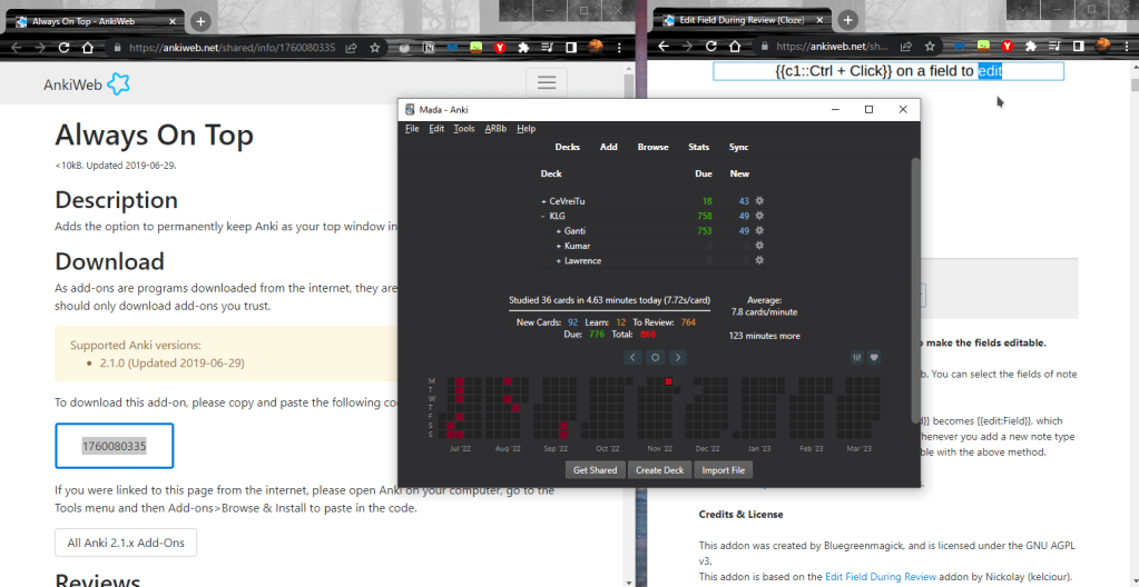 Acest add-on este foarte binevenit. Mi-aș fi dorit să știu de el când am început cu Anki. Always on top înseamnă că dacă aveți mai multe ferestre deschise, aplicația Anki o să fie mereu on top .