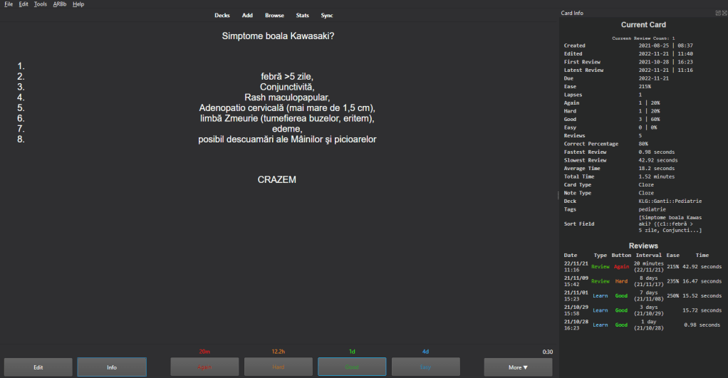 Butonul de Info îți arată mai multe informații despre cardul tău. Poți vedea când ai învățat prima dată cardul, de câte ori ai trecut prin el și eventual gradul de dificultate (perceput de tine).