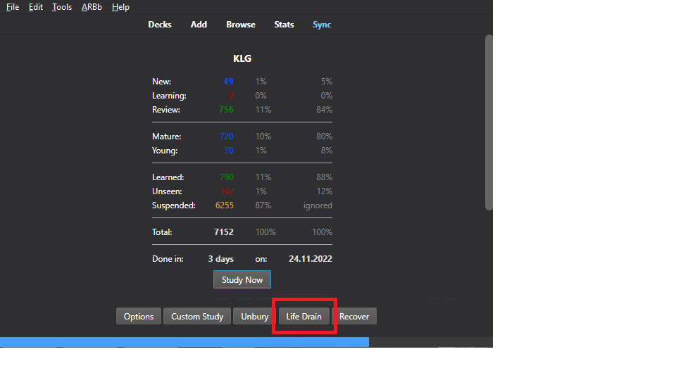 Simularea de față este realizată pentru deck-ul meu KLG pentru o perioadă de 365 de zile. Câte carduri trebuie să repet+învaț ca să am toate cardurile mature în 365 de zile (a se avea în vedere că nu începe de la 0 carduri învățate). Presupunând că aș face 50 de carduri noi zilnic (pe lângă cele pe care le repet) aș termina cardurile noi prin mai (dacă încep în decembrie). Desigur, voi veți mai adăuga carduri noi între timp deci să luați în considerare acest lucru (puteți simula și acest lucru, rândul de jos din stânga).